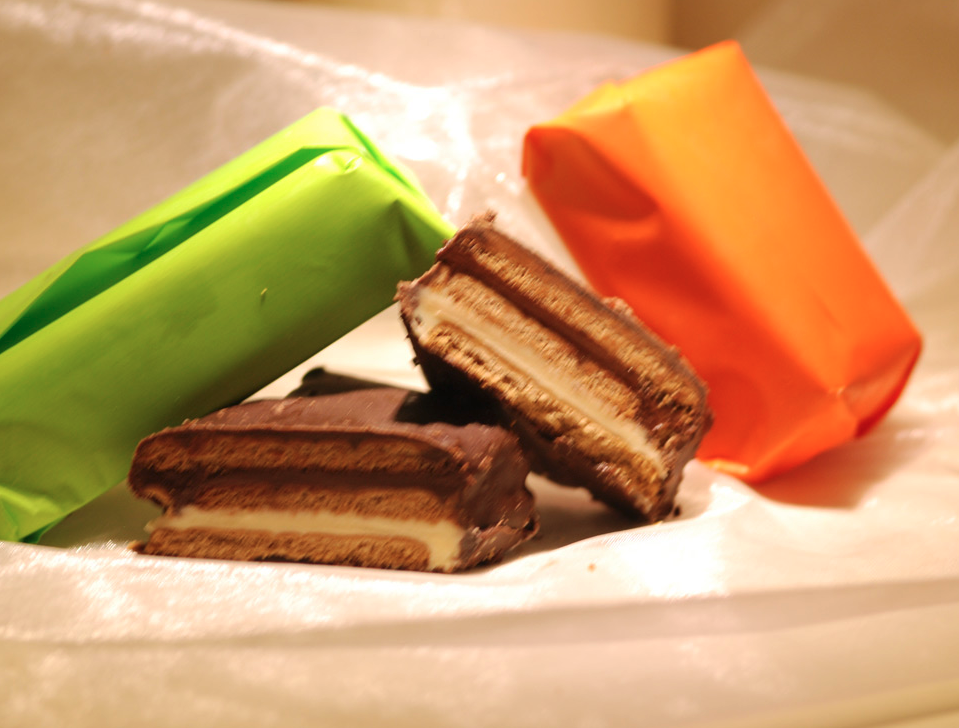 Known for its chocolatey cream layers, it offers a balanced sweetness and a light, airy bite.