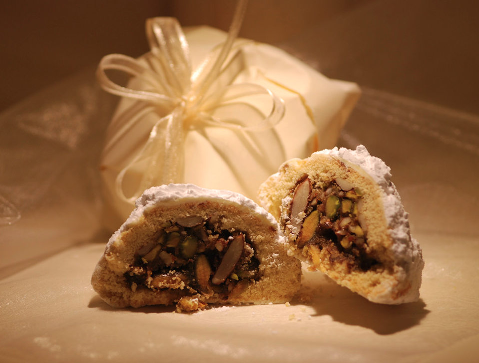 Mamoul is a type of delight with a softer, sweeter dough, where the white powdered sugar is replaced by an intricate, elegant design.